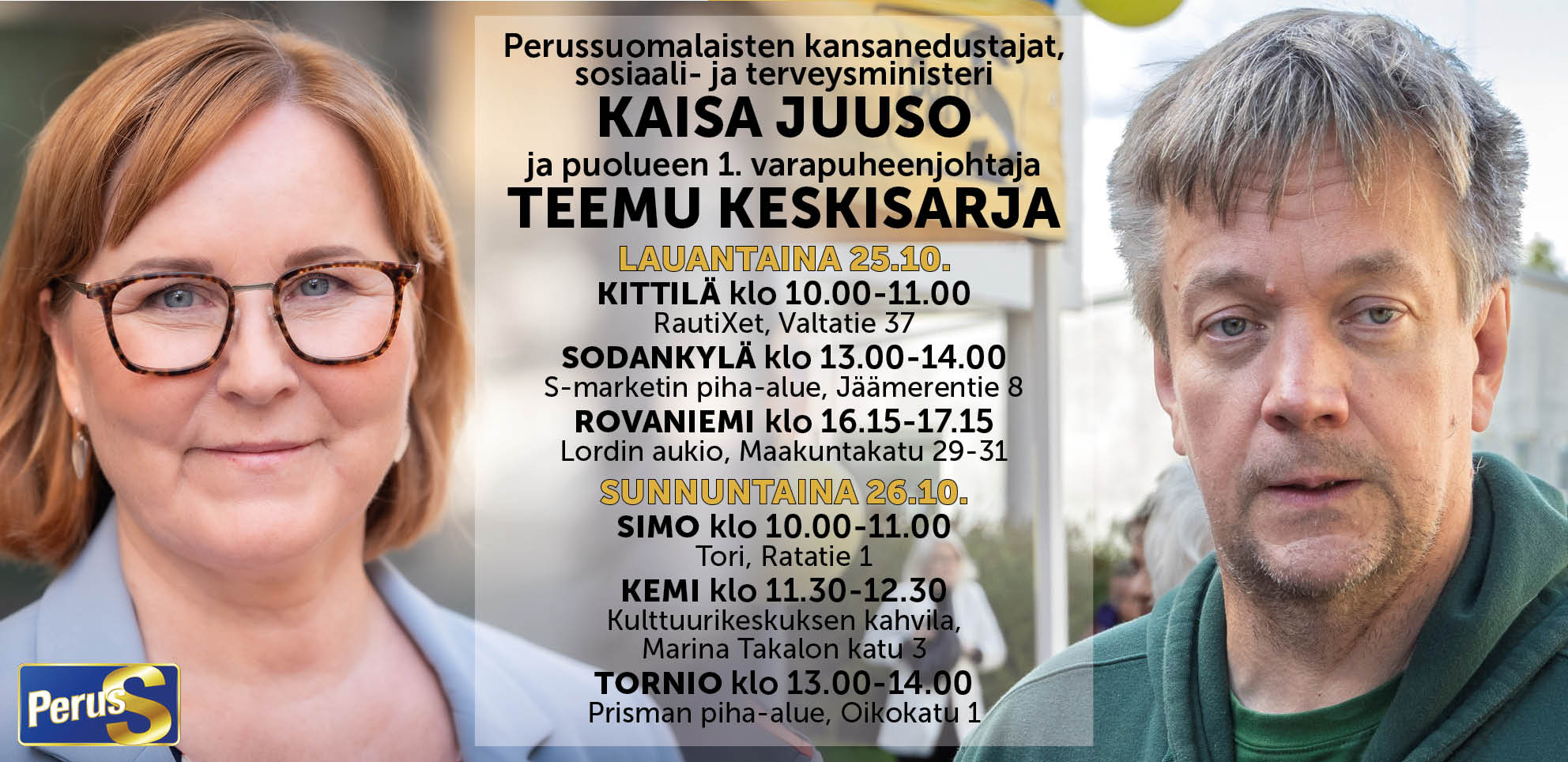 Sosiaali- ja terveysministeri Kaisa Juuso sekä Perussuomalaisten 1. varapuheenjohtaja Teemu Keskisarja Kemissä 26.10.2025